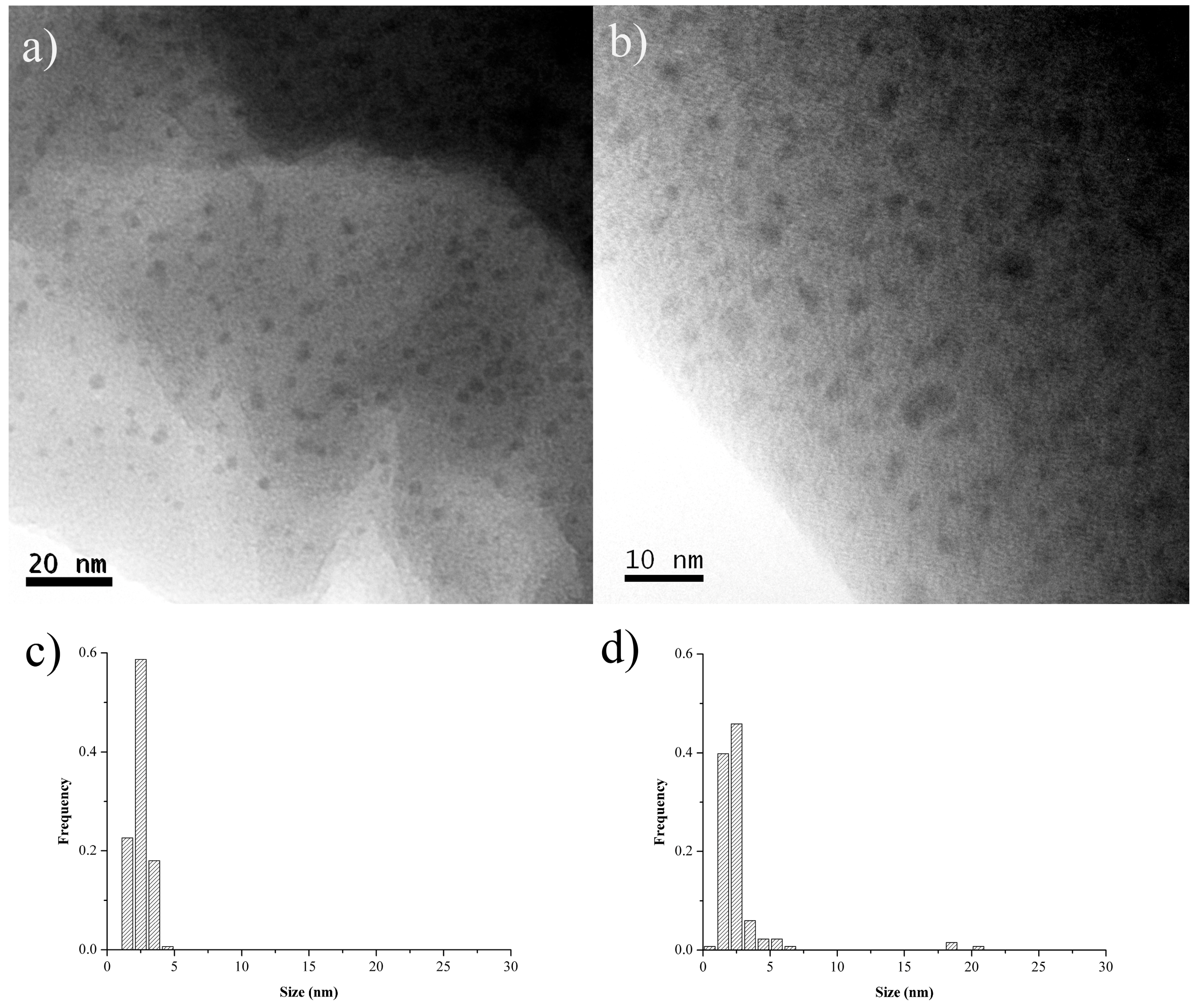 TEM high enlargement images of Pd-pol after the (a) first and (b) seventh cycle of the quinoline reduction using NaBH4 at 60 °C in water. Pd NPs particle size distributions of Pd-pol after the (c) first and (d) seventh cycle of the quinoline reduction using NaBH4 at 60 °C in water (reaction conditions reported in Table 4).