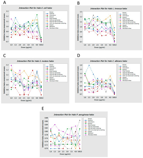 Interaction halo plots, (A) E. coli; (B) L. innocua; (C) S. mutans; (D) C. albicans; and (E) P. aeruginosa. Paper discs were 0.7 cm in diameter. Halo diameter in cm is given in the Y-axis vs. dose concentration in µg/mL in the X-axis. Inhibition was measured based on halo diameter in excess of 0.7 cm with higher peaks indicating the most active doses of extracts that produce inhibition halos of greater diameter.