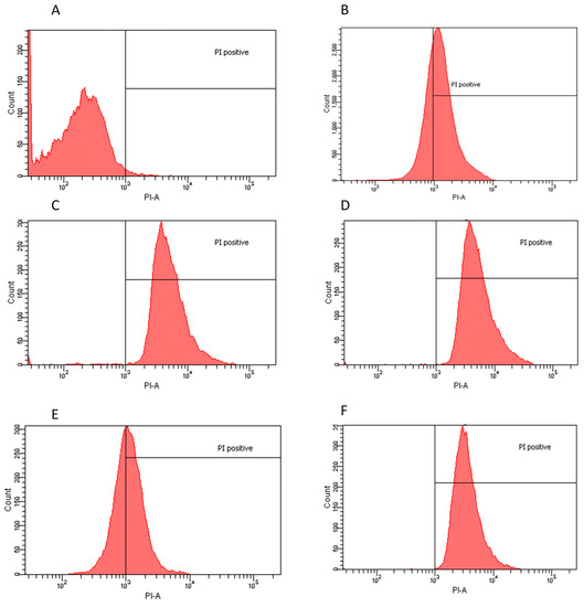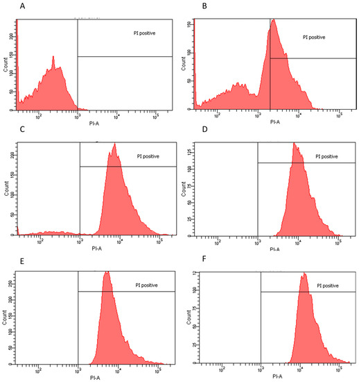 Flow cytometry histograms derived from scatter plots showing fluorescence of live (<103) or dead (>103) E. coli stained with propidium iodine (PI) post 24 h incubation with controls or extracts. X-axis corresponds to the PI positive marked microorganisms and Y-axis to the total cell count. (A) E. coli sample PI negative control, 96.7% viability; (B) E. coli incubated for 30 min with 70% ethanol PI positive control, 48% viability; (C) water dry leaf non-boiled extract 4 μg/mL, 5.7% viability; (D) water non-dried leaves non-boiled, 1.5 μg/mL 0.1% viability; (E) ethanol 4 μg/mL, 0.1% viability; and (F) ethyl Acetate 1 μg/mL, 0.3% viability.