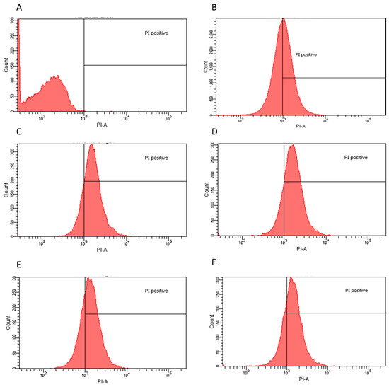 Flow cytometry histograms derived from scatter plots showing fluorescence of live (<103) or dead (>103) of L. innocua stained with PI post 24 h incubation with controls or extracts. X-axis corresponds to the PI positive marked microorganisms and Y-axis to the total cell count. (A) L. innocua sample PI negative control, 99.9% viability; (B) L. innocua incubated for 30 min with ethanol 70% PI positive control 46.4% viability; (C) water dry leaf non-boiled extract 4 μg/mL, 17.5% viability; (D) water non-dried leaves non-boiled 2.5 μg/mL, 16.7% viability; (E) ethanol 4 μg/mL, 28.5% viability; and (F) water dry leaf boiled 2 μg/mL, 25.6% viability.
