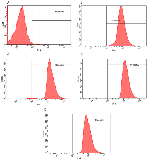 In order to determine the bactericidal, bacteriostatic or fungicidal effect of the most significant extract-dose interactions, viability assays using PI (Clontech, Clontech Laboratories, Inc. A Takara Bio Company, Terra Bella Avenue, Mountain View, CA, USA) were performed. Briefly, microorganisms were grown in a TSB suspension; 1 mL of each culture was centrifuged at 13,400 rpm and re-suspended in PBS pH 7.4. Extracts were then added and incubated at 37 °C for bacteria and 25 °C for C. albicans, for 24 h. Vials were centrifuged again and bacterial and fungal pellets were re-suspended in PBS plus 5 µL of PI. Samples were incubated for 10 min in the dark at room temperature before processing. Samples were analyzed in a BD FACSCanto Flow Cytometer (BD Biosciences, Mississauga, ON, Canada), using a single laser emitting excitation light at 488 nm [44].