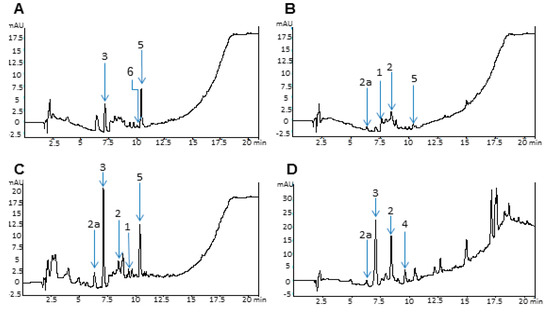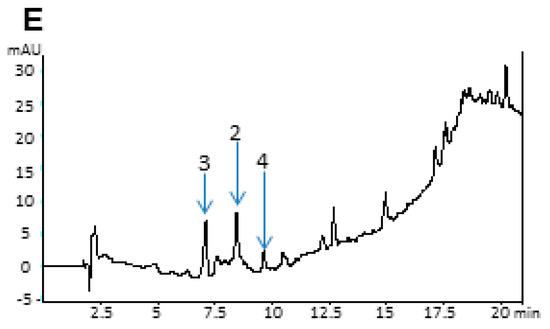 High-Performance liquid chromatography (HPLC) chromatogram at 254 nm of R. discolor extracts: (A) Water dry leaves non-boiled extract; (B) Water non-dry leaves non-boiled extract; (C) Water dry leaves boiled extract; (D) Acetone extract; (E) Ethyl Acetate extract. Selected chromatographic peaks correspond to the following: (1) Ferulic acid, (2) Vanillic acid, (2a) Glycosylated vanillic acid, (3) Chlorogenic acid, (4) P-coumaric, (5) Rhoeonin, and (6) Anthocyanin pigment No. 2.