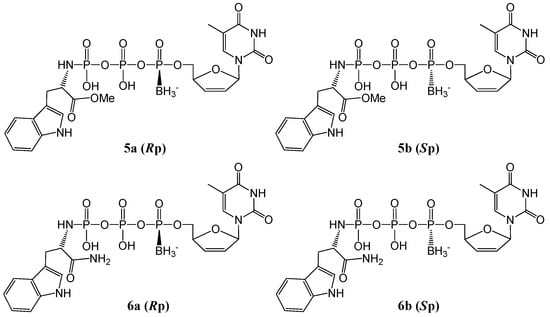 Structures of d4T α-P-borano-γ-P-N-l-tryptophanyltriphosphates (5a, 5b, 6a, 6b).