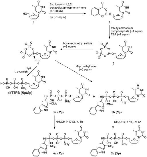 One-pot synthesis of d4T α-P-borano-γ-P-N-l-tryptophanyltriphosphate 5a, 5b, 6a, and 6b stereoisomers by a modified cyclic trimetaphosphate approach.