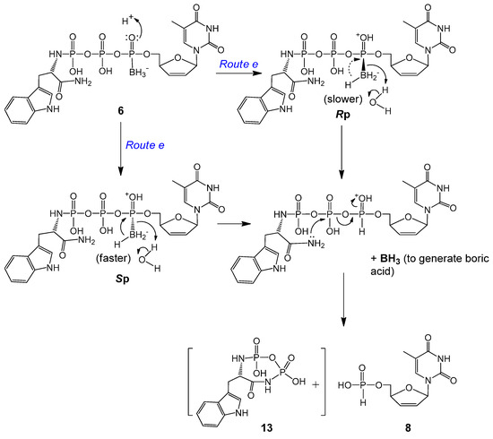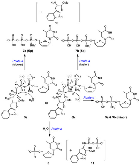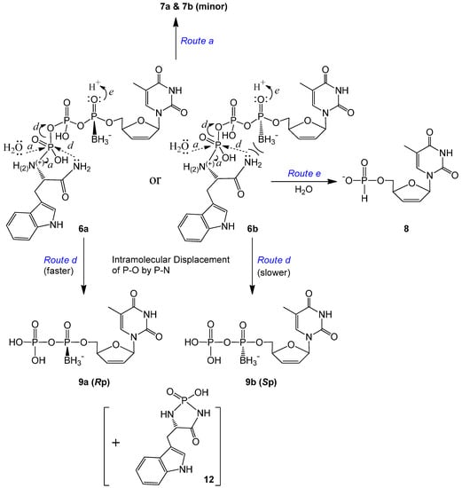 Direct attack by water on the α-P of 5 to generate d4T boranomonophosphate (d4TMPB) was not supported by our LC-MS data; instead, d4TH-P 8 was detected as one of the major degradation products in our LC-MS experiments (Table 2). As the electron distribution is more polarized toward oxygen on the boranated phosphorus [19,43], we propose that the non-bridged oxygen on the α-P is easily protonated, and this protonation effectively promotes an intramolecular nucleophilic attack by a hydride from the borane group (BH3), which leads to d4TH-P 8 formation (intramolecular reduction via Route b, Scheme 2). This reductive deboranation process, followed by an intermolecular hydrolysis step, is further outlined in Scheme 3. It was noticeable that the Rp isomer generated considerably less 8 than did the Sp isomer during the same incubation times (Table 2). We propose that for the Rp isomer, the borane group is pointing front, enabling hydride attack on the α-P from the backside (the same side with the big moiety TrpOMe); therefore, the reduction process is slower. Whereas for the Sp isomer, the hydride attacks the α-P from the front side, and the deboranation step further relieves the steric interaction between the borane and TrpOMe moieties in the rear, and hence faster. Only a small amount of compound 11 (TrpOMeDP, M− 377) was detectable, likely due to lability of the P–N bond.