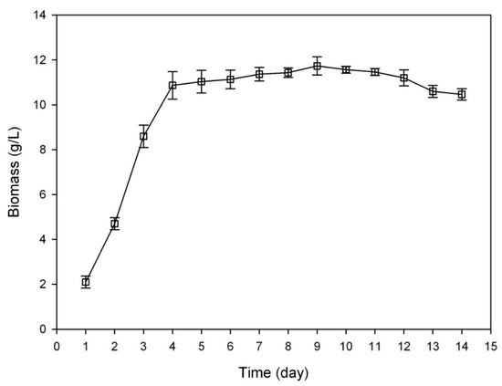 The growth curve of C. sinensis grown on basal medium (BM). The error bars indicate standard deviations of the dry weight.