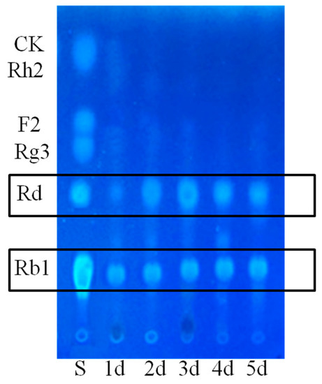 As we can see in Figure 2, culture-dependant transformation of Rb1 to Rd (1) was apparent on days 2–5, but the production of Rd (1) from 1-day-old culture was not obvious. Although there was no apparent difference in the biotransformation performances between the cultures from day 2 to day 5, the liquid culture of C. sinensis would gradually become mucous along with the accumulation of exogenous metabolites such as polysaccharides and proteins, leading to complex conditions for further processing. Besides, preparing older cultures could be time-consuming, suggesting that the 2-day-old culture of C. sinensis was more suitable than the other three cultures of day 3, day 4 and day 5.