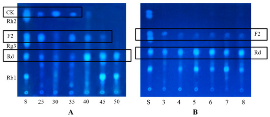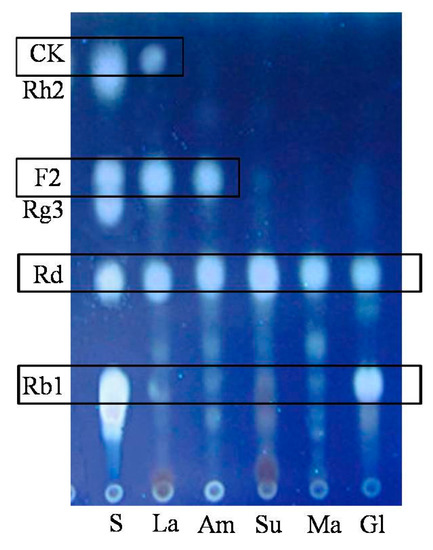 In this study, TLC was performed with silica gel plates (GF254, Merck Millipore, Shanghai, China), and CHCl3–CH3OH–H2O (65:35:10, v/v, lower phase) was used as the developing solvent [45]. The spots on the TLC plates were detected through spraying with 10% H2SO4/ethanol solution, followed by heating at 105 °C for 5 min. TLC spectra were analyzed by a TLC visualizer CD 60 (DESAGA, Lindenfels, Germany) and pictures of TLC spectra were shot under UV light at 365 nm.