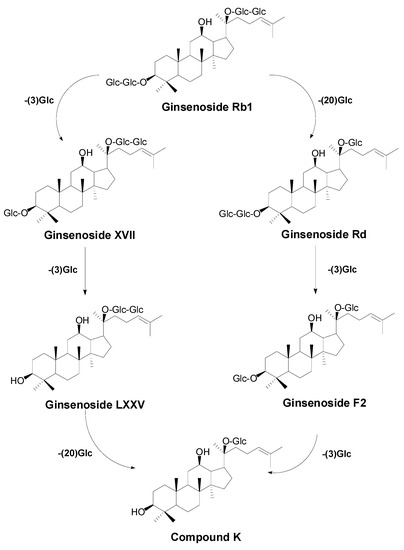 - Yan, Q.; Zhou, W.; Shi, X.L. Biotransformation pathways of ginsenoside Rb1 to compound K by β-glucosidases in fungus Paecilomyces bainier sp. 229. Process Biochem. 2010, 45, 1550–1556. [Google Scholar] [CrossRef]