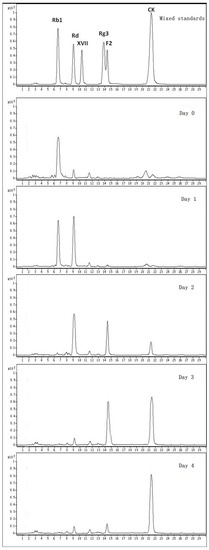 Ginsenoside Rb1 was gradually transformed into Rd at the 1st and 2nd day after being added to the optimal culture of C. sinensis and became nearly untraceable when the 2nd day was over (Figure 8 and Figure 9). Ginsenoside Rd was quickly approaching its utmost production in the first two days as long as the content of ginsenoside F2 and CK were about to accumulate from the 2nd day of biotransformation. Thereafter, the amount of Rd decreased sharply on the 3rd day, leading to a significant increase in the amount of F2 and CK. Nevertheless, most of ginsenoside F2 was ultimately converted into CK and the hydrolysis process ceased after the 4th day of biotransformation. During the whole process, neither ginsenoside XVII nor LXXV were detected, informing that the biotransformation of Rb1 to CK by C. sinensis was highly isomer-selective.