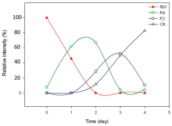 Relative concentration of ginsenoside Rd, F2 and CK after biotransformation.