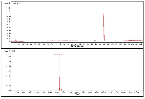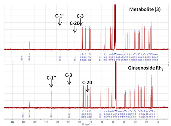 Metabolites 1 and 2 were identified to be ginsenoside Rd and F2, respectively, by HPLC-Q-TOF-MS and TLC comparison to reference ginsenosides, as demonstrated in Section 2.1 and Section 2.2. The combination of HPLC-Q-TOF-MS and 13C-NMR was used to unambiguously characterize metabolite 3. The HRMS data of 3 showed a similar [M + HCOOH − H]− m/z with CK and Rh2 of 667.4787, calculated for a molecular formula of C36H62O8 (Figure 11). According to literature [42,43,44], the major structural difference between Rh2 and CK is the linking position of the glucosyl moiety, leading to obvious variations of chemical shifts at C-3, C-20 and glucosyl C-1″. As shown in Table 4 and Figure 12, metabolite 3 was proven to be CK due to the identical chemical shifts which distinguished it from Rh2 at C-3 (δ = 78.16), C-20 (δ = 83.55) and C-1″ (δ = 96.92).