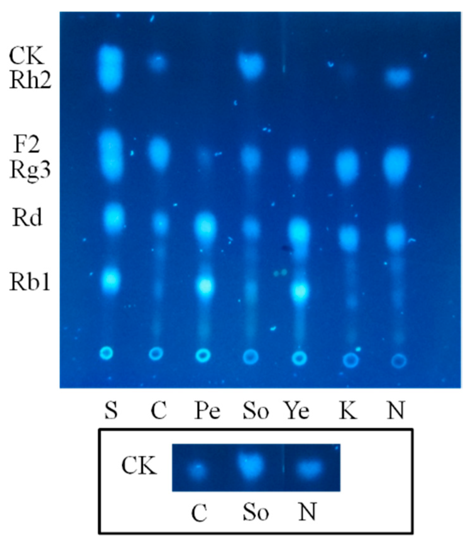 - Yang, Y.; Wang, Y.; Yan, M.; Sun, C.; Zheng, P. Screening of plant pathogenic fungi by ginsenoside compound K production. Zhongguo Zhong Yao Za Zhi 2011, 36, 1596–1598. [Google Scholar] [PubMed]