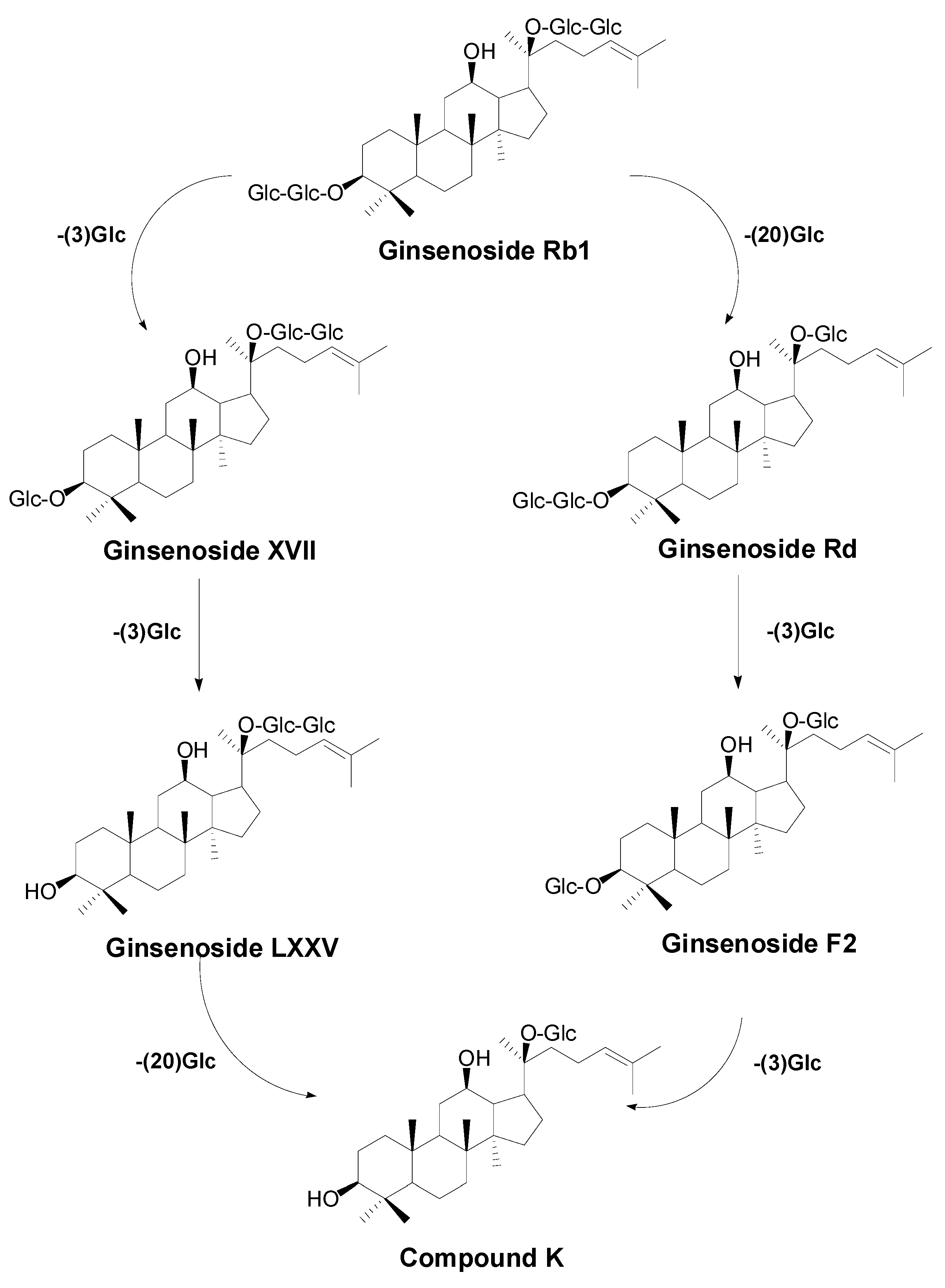 | CK R1 = Glc, R2 = H | Metabolite (3) | Rh2 R1 = H, R2 = Glc | |