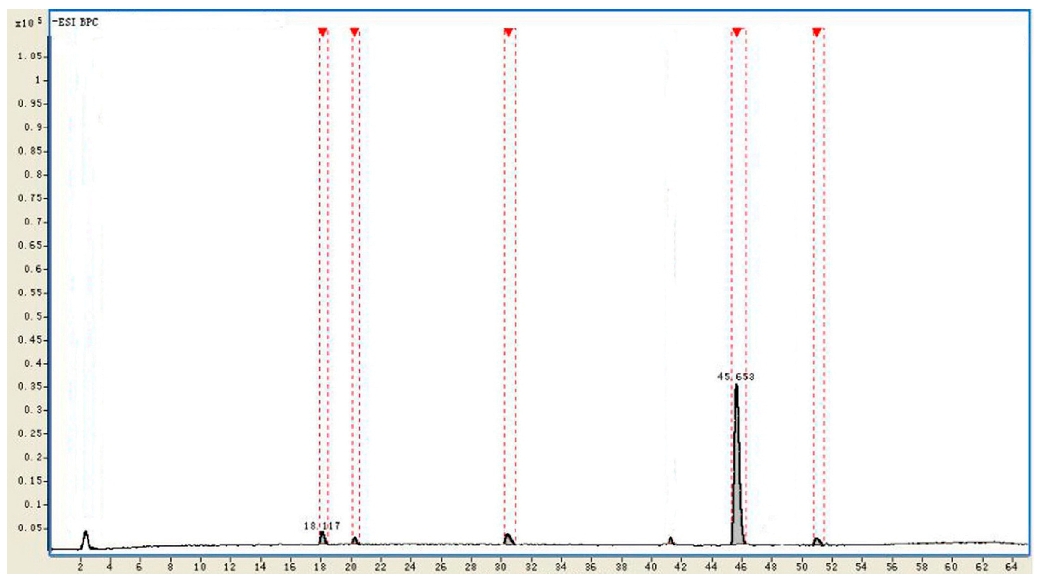 | No. | tR (min) | Identificaiton | Intensity | Relative Intensity (%) | Diff. (ppm) |