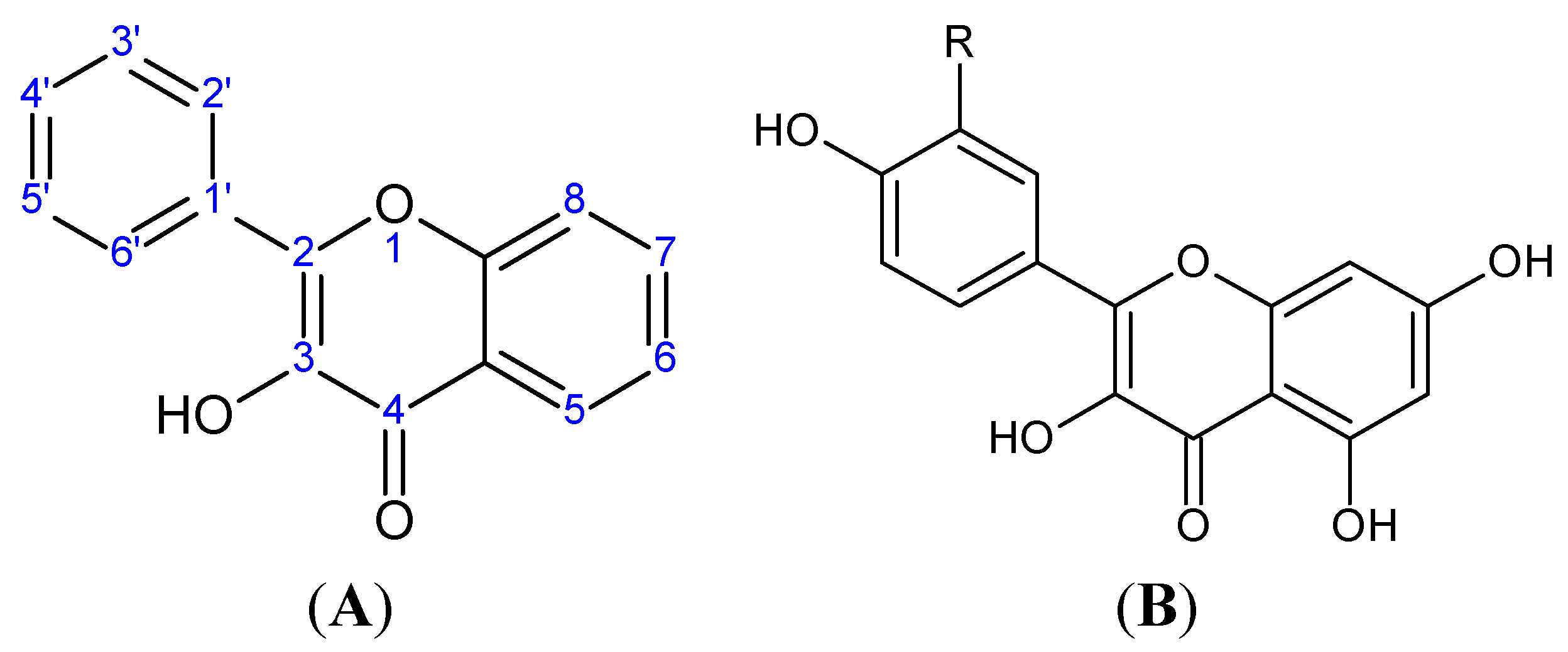 (A) General structural formula of flavonols; (B) structural formula of quercetin (R = OH) and kaempferol (R = H).