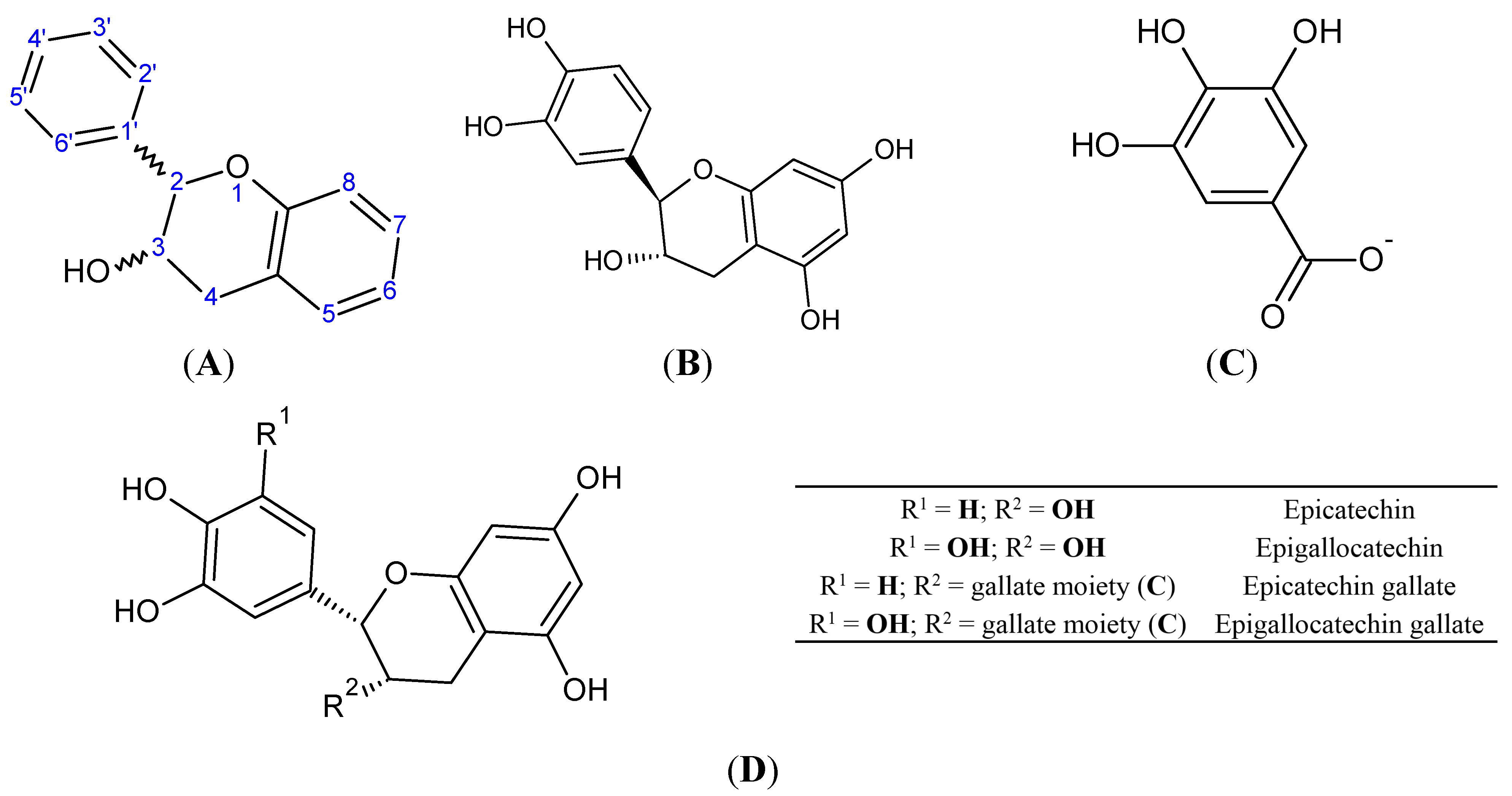 (A) General structural formula of flavan-3-ols; (B) (+)-catechin (2R,3S), the more common of the two catechin enantiomers; (C) gallate moiety; (D) Substituents of catechin derivatives.