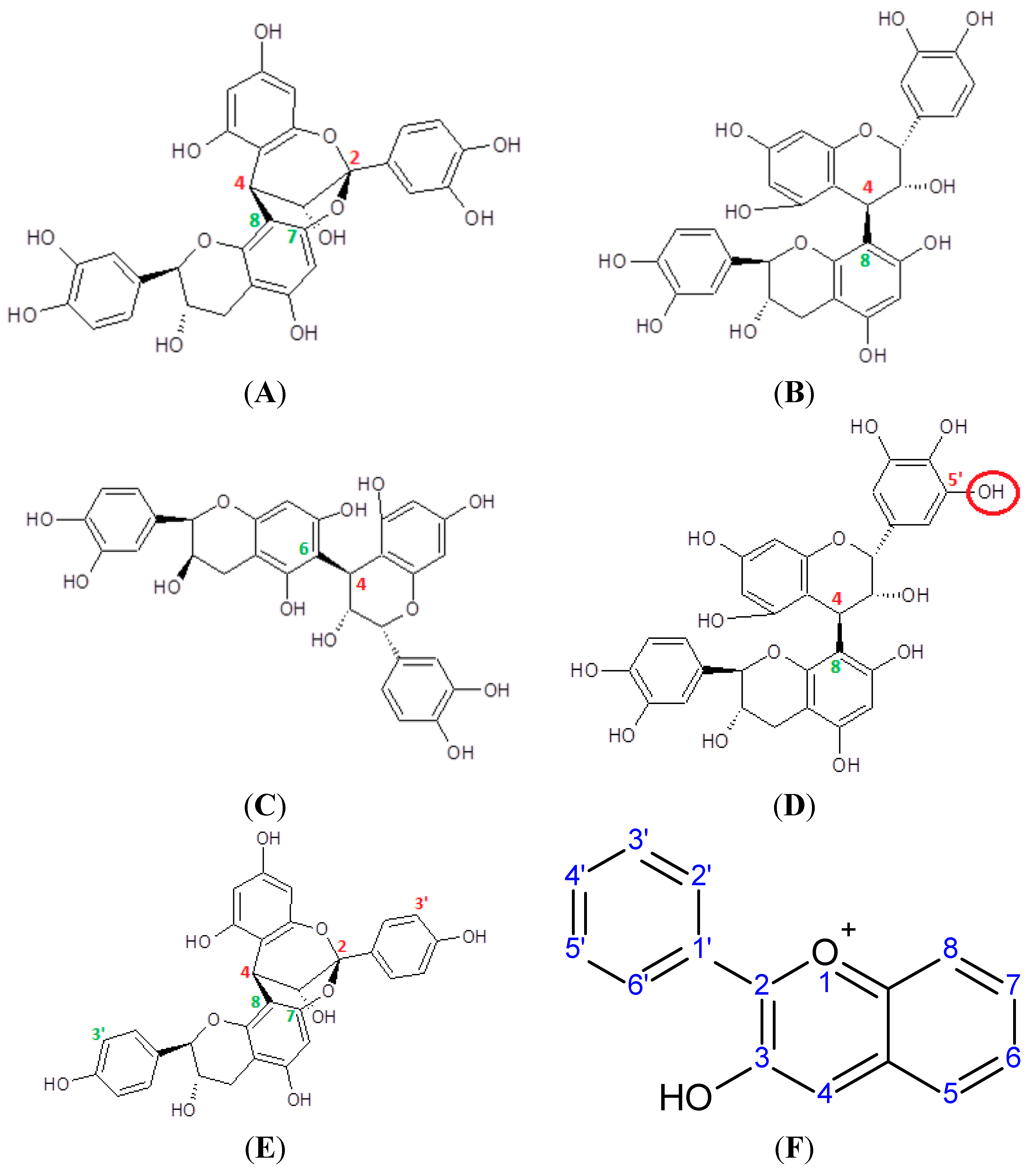(A) Dimeric A type procyanidin (epicatechin-catechin dimer) with C-4→C-8 linkage and C-2→O→C-7 ether bond. Red numbering: epicatechin moiety; green: catechin moiety; (B) dimeric B type procyanidin (epicatechin-catechin) with C-4→C-8 linkage. Red: epicatechin moiety; green: catechin moiety; (C) dimeric B type procyanidin (epicatechin-epicatechin) with C-4→C-6 linkage; (D) dimeric B type prodelphinidin (EGC-catechin) with C-4→C-8 linkage. Red: EGC; green: catechin. Additional OH group at 5′ is marked; (E) dimeric A type propelargonidin (epiafzelechin-afzelechin) with C-4→C-8 and C-2→O→C-7 bonds. Red: epiafzelechin; green: afzelechin. Note the lack of OH groups at the both 3′ positions; (F) general structural formula of anthocyanidins.