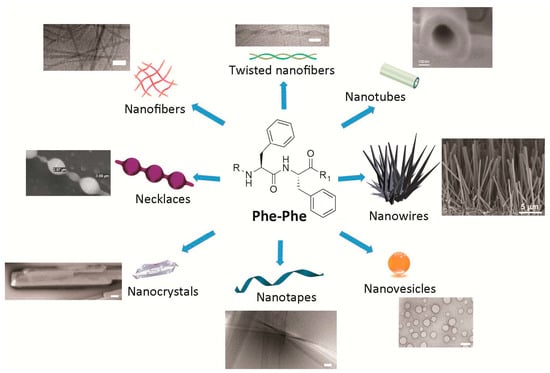 The Phe-Phe motif is an extremely versatile self-assembling building block. Interestingly, subtle changes introduced to the chemical structure of the Phe-Phe derivative are sufficient to obtain different nanomorphologies (Figure 1). Alternatively, assembly of any one compound can be driven towards distinct nanoassemblies by varying the experimental conditions. In either case, there is yet no general over-arching principle for the ex novo design of specific nanostructures, although the understanding of these systems, and the ability to predict their supramolecular behavior, is rapidly progressing as more reports are generated on the topic.