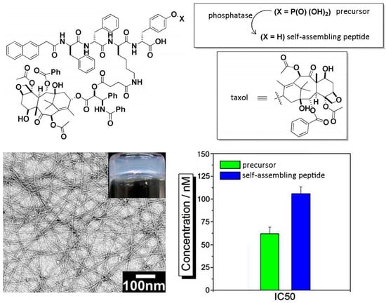 Chemical structure of a self-assembling peptide derivative covalently linked to taxol and formed upon phosphatase conversion of a phosphate precursor (top); upon self-assembly, a nanostructured hydrogel was formed and the IC50 calculated (bottom). Adapted with permission from ref. [63] © 2013 American Chemical Society.