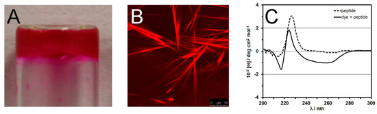 Rhodamine B actively participates in the assembly process of a tripeptide to yield a self-supportive hydrogel (A). Confocal fluorescence microscopy highlights the presence of the dye in the supramolecular structures (B); resulting in different circular dichroism spectra relative to the peptide alone (C) [68].