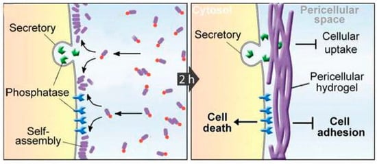 Novel therapeutic paradigms are being developed that incorporate the unique properties of self-assembling short peptides. In one interesting example, the selective formation of a hydrogel “nanonet” in the pericellular space around cancer cells was demonstrated possible through the use of precursors that assemble only when processed by dephosphorylase enzymes overexpressed by cancer cells (Figure 4). In this way, the nanonet effectively blocks cellular exchange selectively for cancer cells, eventually leading to apoptosis [75]. As another example, combination of self-assembling Phe-Phe, polydopamine spheres, and Fe3O4 magnetic nanoparticles blended different properties into novel nanostructures that formed adhesive nanotubes and magnetic hydrogels under mild conditions, creating scope for stimuli-responsive biomaterial use, for instance for drug delivery or tissue engineering [76].