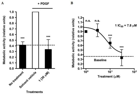 Inhibition of VSMC proliferation by gentisin (1), determined by the resazurin conversion method. Cells were treated with the indicated concentrations of 1 for 48 h. (A) represents the data obtained from VSMC treated or untreated with PDGF, as well as the inhibitory effect of 30 µM 1 on PDGF-induced VSMC proliferation; (B) depicts the results obtained from dose response studies (investigated concentrations: 1, 3, 10, and 30 µM) used to determine the IC50 of 1. Values are presented as means ± SD, relative to the PDGF stimulated solvent vehicle control (0.1% DMSO) (n = 3). *** p < 0.001, n.s. not significant (ANOVA/Bonferroni).