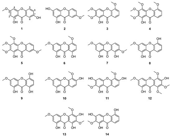 Moreover, eight xanthone derivatives (1,8-dihydroxy-3,7-dimethoxyxanthone (methylswertianin) (7) [12], 1,5-dihydroxy-3-methoxyxanthone (mesuaxanthone A) (8) [14], 1,5,8-trihydroxy-3-methoxyxanthone (bellidifolin) (9) [15], 1,6-dihydroxy-3,5-dimethoxyxanthone (10) [16,17], 1,3,6-trihydroxy-2,5-dimethoxyxanthone (11) [18], 1,6-dihydroxy-3,5,7,8-tetramethoxyxanthone (12) [16,19], 1,6,8-trihydroxy-3,5,7-trimethoxyxanthone (13) [16], and 1,3,5-trihydroxy-2-methoxyxanthone (tovopyrifolin C) (14) [20], Figure 2) previously isolated from the aerial parts of Centaurium erythraea [13], well known as small centaury, were also selected for biological testing. Compound 6, isolated from F. caroliniensis, is also present in C. erythraea [13]. These xanthone derivatives are structurally similar to compound 1, but with a slightly different substitution pattern. They bear three to six substituents, all hydroxy or methoxy groups, in various positions.