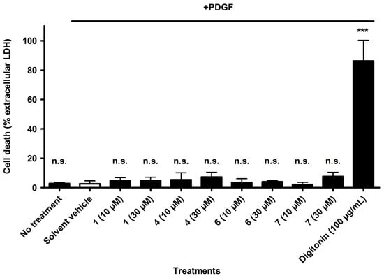 Determination of potential cytotoxic effects of compounds 1, 4, 6, and 7. Digitonin (100 µg/mL, corresponding to 81 µM) was used as positive control, vehicle (0.1% DMSO) with and without PDGF was used as negative control. Values are presented as means ± SD (n = 3). *** p < 0.001, n.s. not significant (ANOVA/Bonferroni).