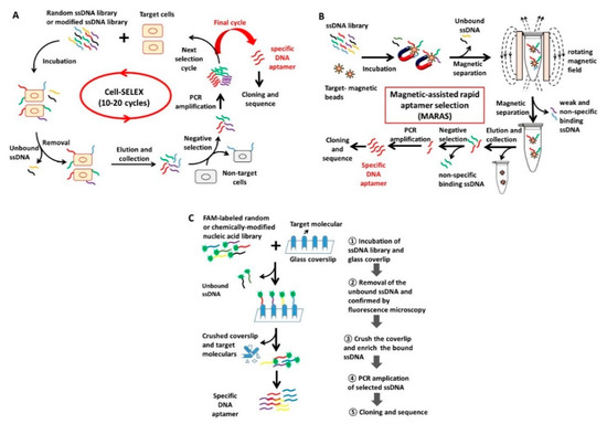 Evolution of methods for DNA aptamers generation. (A) Cell-SELEX: The random ssDNA pool is first incubated with target cells on ice. After washing, the bound DNAs are eluted by heating to 95 °C. The eluted DNAs are then incubated with non-target cells for negative selection. Those that do not bind to negative targets are retained and amplified by PCR. The PCR products are separated into ssDNA for further rounds. After 10–20 cycles, the selected ssDNAs are cloned and sequenced for aptamer identification; (B) Magnetic-assisted rapid aptamer selection (MARAS): The target-coated magnetic beads are incubated with the ssDNA pool. The beads with bound sequences are then separated from the unbound sequences with a U-shaped magnet or magnetic stand. After re-dispersion, the beads are put in an externally applied rotating or alternating magnetic field. During this process, the weak and non-specific binding sequences are released and separated. The strong-binding sequences are finally released from the beads by heating and then incubated with the beads without a target for the negative selection. The selected sequences are amplified, cloned and sequenced as usual; (C) One-step Selection: A FAM-labeled oligonucleotide library is incubated with a target immobilized on a glass coverslip that was coated with N-hydroxysuccinimide (NHS) functionalized polyethylene glycol (PEG). Unbound sequences are discarded by extensive washing followed by monitoring with fluorescence microscopy. The coverslip is later crushed and the bound sequences are eluted by heating in water. The selected aptamers are amplified, cloned and sequenced as usual.