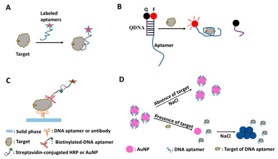Scheme showing examples of the modes used in DNA aptamer-based detection. (A) Direct binding-based mode: The signal-molecule-labeled aptamers directly bind to the immobilized or free target. The signal molecules on the target are detected directly; (B) Target-induced structural switching mode: A fluorophore-labeled DNA aptamer forms a partial duplex with a small oligonucleotide modified with a quenching moiety (QDNA) in the absence of the target, bringing the fluorophore (F) and the quencher (Q) into close proximity for maximum fluorescence quenching. When the target is introduced, the aptamer prefers to form the aptamer-target complex. The binding of the target to the aptamer will change the structure of the aptamers and release the partially complementary quencher, which will trigger the increase of the signal; (C) Sandwich-like mode: The aptamer or antibody is immobilized on the solid phase as the capturer. The captured target is reported by the biotinylated aptamer, which displays the signal through further binding to the streptavidin-conjugated HRP or AuNP; (D) Target-induced dissociation mode: DNA aptamers coil around the surface of the gold nanoparticles (AuNPs) and stop the salt-induced aggregation of AuNPs. When the target appears, the DNA aptamers bind to the target and release from the AuNPs. The AuNPs without the cover of aptamers aggregate in the salt solution and change color from red to purple.