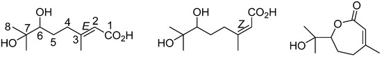 Structures of (Z/E)-3,7-dimethyl-2,6-octadienoic acid and its 1,6-olide.