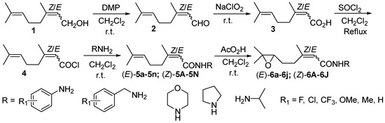 (Z/E)-3,7-dimethyl-2,6-octadienamide derivatives and their 6,7-epoxy analogues were synthesized in moderate to excellent yields in four steps with the commercially available nerol/geraniol as raw materials. All the compounds were characterized by HR-ESI-MS and 1H-NMR spectral data. The preliminary bioassays showed that some of these compounds, such as 5C, 5I and 6b exhibit 94.0%, 93.4% and 91.5% inhibition rates against R. solani at the concentration of 50 µg/mL, respectively. The EC50 values of compounds 5f and 5G were 9.7 and 13.4 µM against R. solani, respectively, while compound 5f had EC50 value of 4.3 µM against F. graminearum. Further syntheses and structure optimization studies on the replacement of aromatic and aliphatic amines with nitrogen-containing heterocyclic amines are in progress in our laboratory.