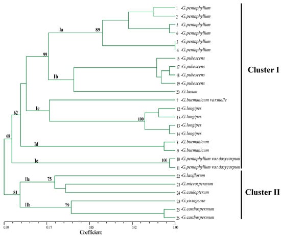3.3. Transferability of SSR Markers and Genetic Relationships among Different Species of Gynostemma
