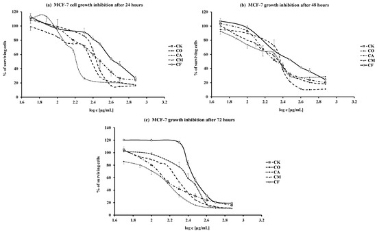(a–c) Time and dose dependent MCF-7 cells growth inhibition after 24(a); 48(b); and 72(c) hours treatment with leaves water extracts from Cornus species (CA—Cornus alba, CO—C. officinalis, CK—C. kousa, CM—C. mas, CF—C. flaviramea).