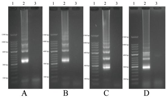 2.11. Evaluation of the MIP-LAMP Assay Using Pork Samples