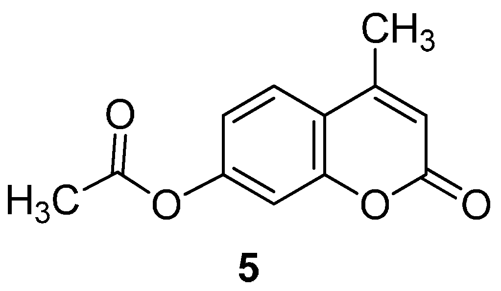 - Lopez-Lopez, M.A.; Balbuzano-Deus, A.; Rodriguez-Dominguez, J.C.; Mesa Hernandez, M.; Fernandez-Villalobo, A.; Reyes, Y.I.; Kirsch, G. A new synthetic route to 4-methylumbelliferyl-β-d-glucopyranosiduronic acid (MUG). Synlett 2007, 2007, 649–651. [Google Scholar]