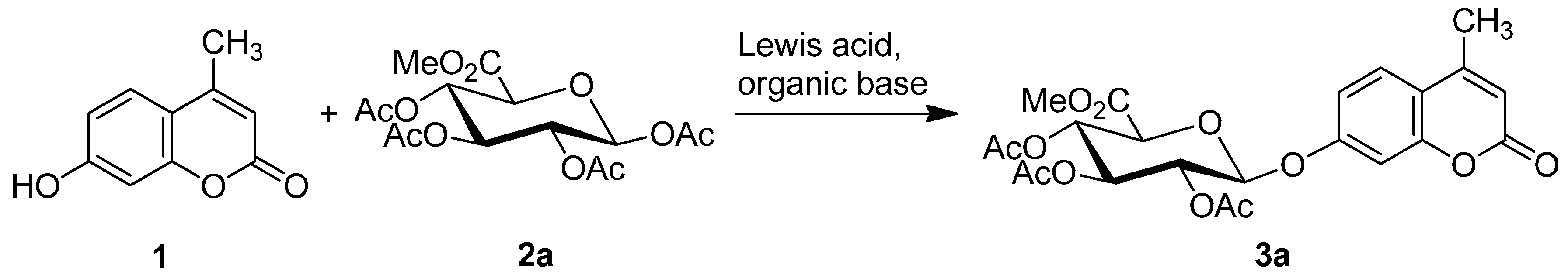 - Brown, R.T.; Stachulski, A.V. Intermediates for glucuronide synthesis: 7-Hydroxycoumarin glucuronide. J. Chem. Res. Synop. 1997, 10, 370–371. [Google Scholar] [CrossRef]