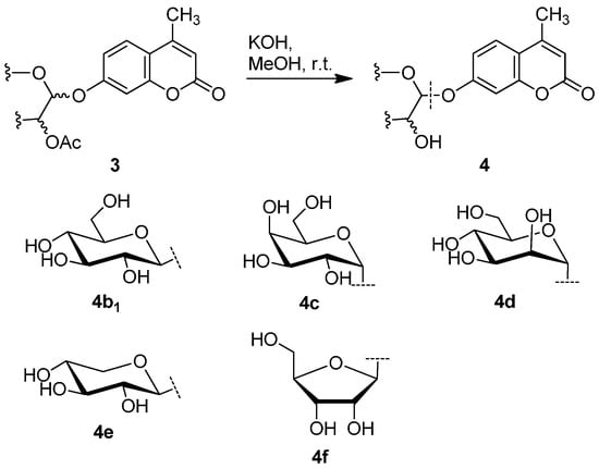 Using this unoptimized method, 4a was obtained in 47% yield. The deprotection of other glycosides 3b1, 3c, 3d, 3e, and 3f via methanolysis catalyzed by KOH at room temperature (r.t., 20–25 °C; Scheme 5), afforded the desired products 4b1, 4c, 4d, 4e, and 4f in 83%, 80%, 80%, 79%, and 79% yields, respectively. Due to little amount obtained, 3b2 was not deprotected.