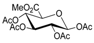 Methyl tetra-O-acetyl-β-d-glucopyranuronate (2a). This compound was prepared according to a literature procedure [38]; white powder; mp: 176–178 °C; {lit. [38] mp: 174.2–175.1 °C}. 1H-NMR (300 MHz, CDCl3): δ = 5.78 (d, J1,2 = 7.7 Hz, 1H, H-1), 5.37–5.13 (m, 3H, H-2, H-3, H-4), 4.20 (d, J = 9.4 Hz, 1H, H-5), 3.77 (s, 3H, Me), 2.14 (s, 3H, OAc), 2.06, 2.06, 2.05 (3× s, 9H, 3× OAc). 13C-NMR (75 MHz, CDCl3): δ = 169.88, 169.40, 169.16, 168.81, 166.79, 91.31 (C-1), 72.93, 71.77, 70.11, 68.88, 53.00, 20.75, 20.54, 20.51, 20.44. 1H- and 13C-NMR spectrograms are seen in the Supplement Materials.