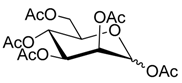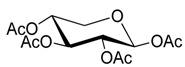 β-d-Xylopyranose tetraacetate (2e) This compound was prepared according to a literature procedure [42]; white acicular crystals; mp: 123–125 °C; {lit. [42] mp: 122–124 °C}. 1H-NMR (300 MHz, CDCl3): δ = 5.73 (d, J1,2 = 6.9 Hz, 1H, H-1), 5.22 (t, J = 8.3 Hz, 1H, H-4), 5.10–4.96 (m, 2H, H-2, H-3), 4.17 (dd, J = 12.0, 5.0 Hz, 1H, H-5a), 3.54 (dd, J = 12.0, 8.4 Hz, 1H, H-5b), 2.13 (s, 3H, OAc), 2.08, 2.07, 2.07 (3× s, 9H, 3× OAc). 13C-NMR (75 MHz, CDCl3): δ = 169.76, 169.73, 169.23, 168.96, 91.96 (C-1), 70.90, 69.41, 68.24, 62.70, 20.73, 20.65, 20.59, 20.53. 1H- and 13C-NMR spectrograms are seen in the Supplement Materials.