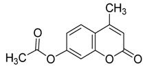 4-Methylumbelliferyl acetate (5) Yellowish white powder; mp: 148–150 °C; Rf = 0.35 (PE–AcOEt, 3:2). 1H-NMR (300 MHz, CDCl3): δ = 7.54 (d, J5,6 = 8.7 Hz, 1H, H-5), 7.04 (d, J6,8 = 2.2 Hz, 1H, H-8), 7.01 (dd, J5,6 = 8.7, J6,8 = 2.2 Hz, 1H, H-6), 6.20 (d, J3,Me = 1.2 Hz, 1H, H-3), 2.36 (d, J3,Me = 1.2 Hz, 3H, H-Me), 2.27 (s, 3H, OAc). 13C-NMR (75 MHz, CDCl3): δ = 168.78 (OAc), 160.51 (C-2), 154.16 (C-7), 153.04, 151.95, 125.41, 118.12, 117.85, 114.52, 110.47 (C-3, C-4, C-5, C-6, C-4a, C-8a), 21.13 (C-Me), 18.74 (C-Me). HRMS (ESI): m/z [M + Na]+ calcd for C12H10NaO4: 241.0471; found: 241.0477. 1H- and 13C-NMR, and HRMS spectrograms are seen in the Supplement Materials.