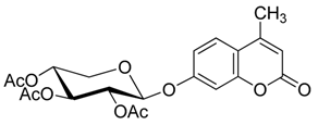 4′-Methylumbelliferyl 2,3,4-tri-O-acetyl-β-D-xylopyranoside (3e) Compound 3e was prepared according to the general procedure for the glycosylation step using 4-MU (352 mg, 2.0 mmol), β-d-xylose tetraacetate (1273 mg, 4.0 mmol, 2.0 equiv.), dry CH2Cl2 (6 mL), TEA (700 μL, 5.0 mmol, 2.5 equiv.) and BF3·OEt2(3218 μL, 25.0 mmol, 12.5 equiv.). The mixture was stirred for 5 h at 20–21 °C (as shown in Table 3). The crude product was purified by flash column chromatography. White powder; yield: 633 mg (73%); mp: 148–153 °C; −49° (c = 1.00, CHCl3). Rf = 0.33 (PE–AcOEt, 3:2); {lit. [43] mp: 158 °C, −45° (c = 2, CHCl3), Rf = 0.65 (AcOEt–benzene, 3:7)}. 1H-NMR (300 MHz, CDCl3): δ = 7.53 (d, J5′,6′ = 8.7 Hz, 1H, H-5′), 6.97–6.92 (m, 2H, H-6′, H-8′), 6.19 (d, J3″,Me′ = 1.2 Hz, 1H, H-3′), 5.31–5.17 (m, 3H, H-1, H-2, H-3), 5.02 (td, J4,5b = 7.1, J4,5a = 4.5 Hz, 1H, H-4), 4.23 (dd, J5a,5b = 12.3, J4,5a = 4.5 Hz, 1H, H-5a), 3.60 (dd, J5a,5b = 12.3, J4,5b = 7.2 Hz, 1H, H-5b), 2.41 (d, J3″,Me′ = 1.2 Hz, 3H, Me′), 2.11, 2.11, 2.11 (3× s, 9H, 3× OAc). 13C-NMR (75 MHz, CDCl3): δ = 169.84, 169.83, 169.36 (3× OAc), 160.88 (C-2′), 158.99 (C-7′), 154.83, 152.22, 125.76, 115.36, 113.59, 113.08 (C-3′, C-4′, C-5′, C-6v, C-4a′, C-8a′), 104.18 (C-8′), 97.77 (C-1), 70.15, 69.59, 68.09, 61.81 (C-2, C-3, C-4, C-5), 20.80, 20.75, 20.71 (3× OAc), 18.70 (C-Me′). HRMS (ESI): m/z [M + Na]+ calcd for C21H22NaO10: 457.1105; found: 457.1112. 1H- and 13C-NMR, and HRMS spectrograms are seen in the Supplement Materials.