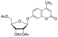 4-Methylumbelliferyl β-d-ribofuranoside (4f) Compound 3f (200 mg, 0.46 mmol) was O-deacetylated for 25 min at room temperature with KOH (1.0 M in anhydrous MeOH; 138 μL, 0.3 equiv.) in anhydrous MeOH (5 mL). The white solid precipitate was filtered off, washed with ethanol until the washings were no longer fluorescent, and dried. White powder; yield: 112 mg (79%); mp: 167–169 °C; −145° (c = 0.15, H2O). 1H-NMR (300 MHz, DMSO-d6): δ = 7.67 (d, J5′,6′ = 8.7 Hz, 1H, H-5′), 7.00–6.96 (m, 2H, H-6′, H-8′), 6.22 (d, J3′,Me′ = 1.2 Hz, 1H, H-3′), 5.60 (s, 1H, H-1), 5.43 (d, J = 4.5 Hz, 1H), 5.08 (d, J = 6.3 Hz, 1H), 4.71 (t, J = 5.4 Hz, 1H), 4.08–4.00 (m, 2H), 3.93 (td, J = 6.0, 3.6 Hz, 1H), 3.55 (ddd, J = 11.7, 5.4, 3.6 Hz, 1H), 3.38–3.29 (m, 1H), 2.38 (d, J3′,Me′ = 0.9 Hz, 3H, Me′). 13C-NMR (75 MHz, DMSO-d6): δ = 160.02 (C-2′), 159.31 (C-7′), 154.26, 153.25, 126.41, 113.81, 113.32, 111.54 (C-3′, C-4′, C-5′, C-6′, C-4a′, C-8a′), 105.06 (C-8′), 103.26 (C-1), 84.82, 74.47, 70.41, 62.52 (C-2, C-3, C-4, C-5), 18.07 (C-Me′). HRMS (ESI): m/z [M + Na]+ calcd for C15H16NaO7: 331.0788; found: 331.0791. 1H- and 13C-NMR, and HRMS spectrograms are seen in the Supplement Materials.