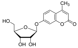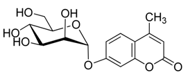 The detection and identification of microorganisms in food, such as prevalent pathogens, e.g., Salmonella and enterohemorrhagic Escherichia coli, is essential for realizing and managing microbiological risks to ensure food safety, a worldwide public health concern [1,2,3]. New techniques that are faster and simpler, based on synthetic enzymatic substrates, have been developed and drawn wide attention in recent decades. Synthetic enzymatic substrates are powerful tools in biochemistry that can produce an easily measured output, such as variation of absorbance or fluorescence, to facilitate the detection of enzymatic activities [4,5,6,7,8,9]. For example, 4-methylumbelliferyl glycosides have been widely exploited in diagnostic microbiology [4,5,6,9], in newborn screening of lysosomal storage disorders (LSDs) [10,11,12,13], for the prediction of glycan structures and potential bioactivities of bovine milk [14], characterizing and identifying vegetables [15], and investigating the molecular mechanisms involved in sperm-oocyte binding and gamete-oviductal epithelium interactions [16], by monitoring the specific cellular glycosidases activities to the substrates. These compounds have low toxicity, are stable under physiological conditions, and are easily hydrolyzed by corresponding glycosidase catalysis, which induces strong fluorescence generated by the released 4-methylumbelliferone (4-MU; 7-hydroxy-4-methylcoumarin). As such, they are also considered as ideal molecular probes for glycobiological studies in which a glycosidase activity needs to be assessed in vitro or in situ research settings [17,18].