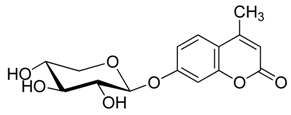 4-Methylumbelliferyl β-d-xylopyranoside (4e) Compound 3e (200 mg, 0.46 mmol) was O-deacetylated for 25 min at room temperature with KOH (1.0 M in anhydrous MeOH; 138 μL, 0.3 equiv.) in anhydrous MeOH (5 mL). The white solid precipitate was filtered off, washed with ethanol until the washings were no longer fluorescent, and dried. White powder; yield: 112 mg (79%); mp: 217–218 °C; −65° (c = 0.10, H2O); {lit. [43] mp: 213–214 °C, −42° (c = 0.10, H2O)}. 1H-NMR (300 MHz, DMSO-d6): δ = 7.70 (d, J5′,6′ = 9.3 Hz, 1H, H-5′), 7.04–7.00 (m, 2H, H-6′, H-8′), 6.25 (s, 1H, H-3′), 5.45 (d, J1,2 = 4.8 Hz, 1H, H-1), 5.19 (t, J =2.3 Hz, 1H), 5.12 (d, J = 4.2 Hz, 1H), 5.06 (t, J = 3.6 Hz, 1H), 3.80–3.71 (m, 1H), 3.43–3.33 (m, 2H), 3.31–3.21 (m, 2H), 2.40 (s, 3H, Me′). 13C-NMR (75 MHz, DMSO-d6): δ = 160.03 (C-2′), 159.83 (C-7′), 154.33, 153.27, 126.44, 114.07, 113.26, 111.71 (C-3′, C-4′, C-5′, C-6′, C-4a′, C-8a′), 103.06 (C-8′), 100.24 (C-1), 76.27, 72.89, 69.21, 65.68 (C-2, C-3, C-4, C-5), 18.09 (C-Me′). HRMS (ESI): m/z [M + Na]+ calcd for C15H16NaO7: 331.0788; found: 331.0793. 1H- and 13C-NMR, and HRMS spectrograms are seen in the Supplement Materials.
