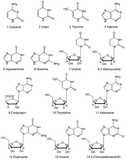 Acetonitrile and methanol were HPLC grade and obtained from Merck (Darmstadt, Germany). Deionized water was purified by Milli-Q system (Millipore, Bedford, MA, USA). Standards of cytosine, uracil, thymine, adenine, hypoxanthine, guanine, uridine, 2′-deoxyuridine, cordycepin, thymidine, adenosine, guanosine, and inosine were purchased from Sigma (St. Louis, MO, USA). The purity of each compound was not less than 98%, as determined by HPLC analysis. Their chemical structures are shown in Figure 2.