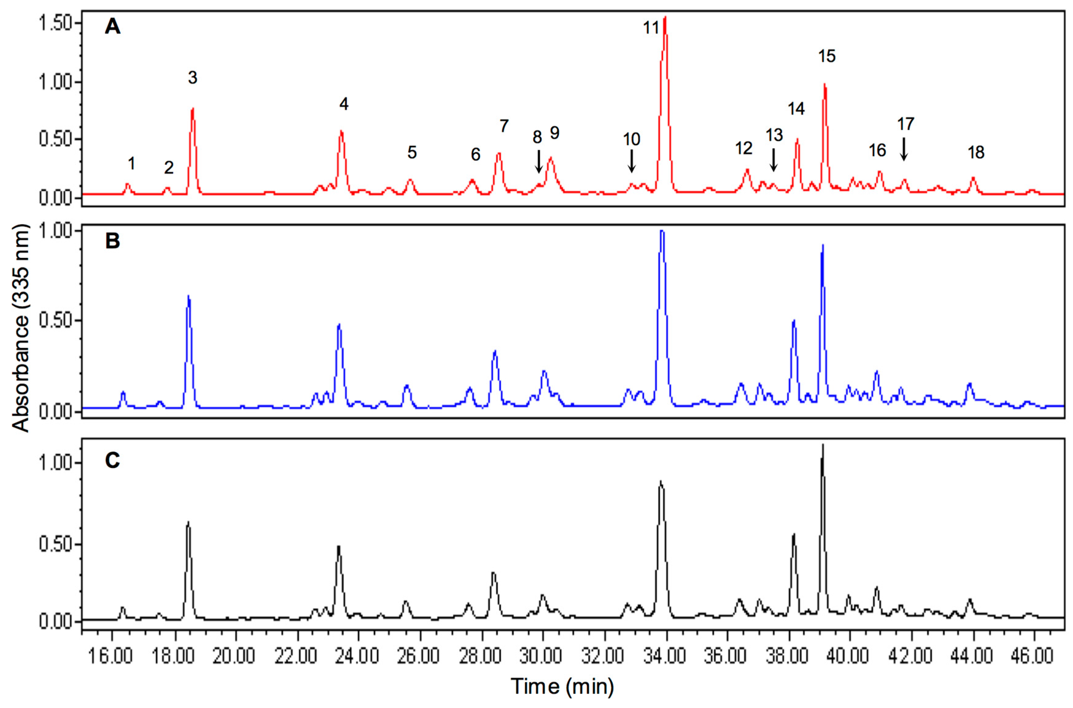 | 14 (38.26) | 254.5, 349.5 | Luteolin | A, B, C |