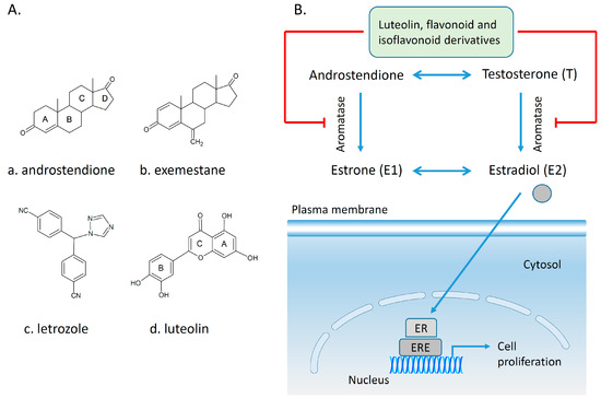 Poyphenols as aromatase inhibitory molecules. (A) Chemical structure of aromatase inhibitors and natural substrates. a. androstenedione (substrate for aromatase); b. exemestane (3rd generation steroidal inhibitor); c. letrozole (3rd generation non-steroidal inhibitor); d. luteolin (flavonoid) [56,57]; (B) Schematic mechanism of activity of aromatase inhibitors in relation to nuclear estrogen receptors. Androgens (androstendione and testosterone) are converted to estrogens (estrone and estradiol) by aromatase; estradiol enters the nucleus and binds to estrogen receptors (ER) which interacts with estrogen response elements (ERE) triggering cell proliferation. So far, luteolin, flavonoid and isoflavonoid derivatives have been found to inhibit aromatase activity in breast cancer cells [64,66,67].