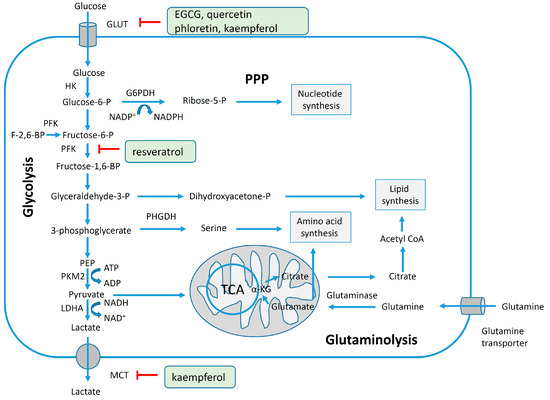 Administration of resveratrol induced the dissociation of the tetrameric PFK-M isoform, isolated from rabbit skeletal muscle to a less active form, the dimer [84]. Glucose uptake was investigated in MCF-7 and MDA-MB-231 breast cancer cells using 3H-2-deoxy-d-glucose (3H-DG). The consumption of 3H-DG in breast cancer cells was found to be suppressed by cytochalasin B, a glucose transporter inhibitor, moderately stimulated by insulin and independent of sodium suggesting that it was mainly mediated by the GLUT family of transporters rather than by sodium-glucose transporter. Administration of EGCG and quercetin suppressed 3H-DG uptake in a concentration-dependent manner in both cells lines and inhibited lactate production only in MCF-7 cells, suggesting that EGCG and quercetin might be considered possible therapeutic/adjuvant agents in breast tumors [81]. Recent data demonstrated that two flavonoids, quercetin and phloretin (0.6–300 µM) inhibited glycolysis indicated by increased glucose and decreased lactate concentrations in the cell culture media of MCF-7 and HBL100 breast cancer cells after 24 h of exposure [82]. The effect of several polyphenols (myricetin, chrysin, genistein, resveratrol and kaempferol with concentration range 10–100 µM) was investigated in a short-term experiment (26 min), resulting in the selection of kaempferol as the most potent inhibitor of 3H-DG uptake in MCF-7 cells (IC50 4 µM). In the long-term experiment (24 h) 30 µM kaempferol inhibited 3H-DG uptake and decreased GLUT1 mRNA levels by 40% associated with inhibition of monocarboxylated transporter (MCT-1) [83]. Taken together the above mentioned reports suggest that polyphenols may be considered as natural inhibitors of the glycolytic pathway in cancer cells (Figure 2).